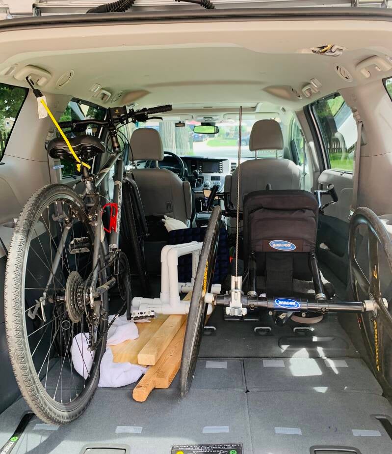 When we decide to pick one of the bike trails out of town for biking/handcycling, that means I gotta load everything into our van. My routine. I got to used to it, yes. Here is a photo, almost everything. I need to load my husband's wheelchair as well at the last minute to start driving. Are your eyes wide open now?