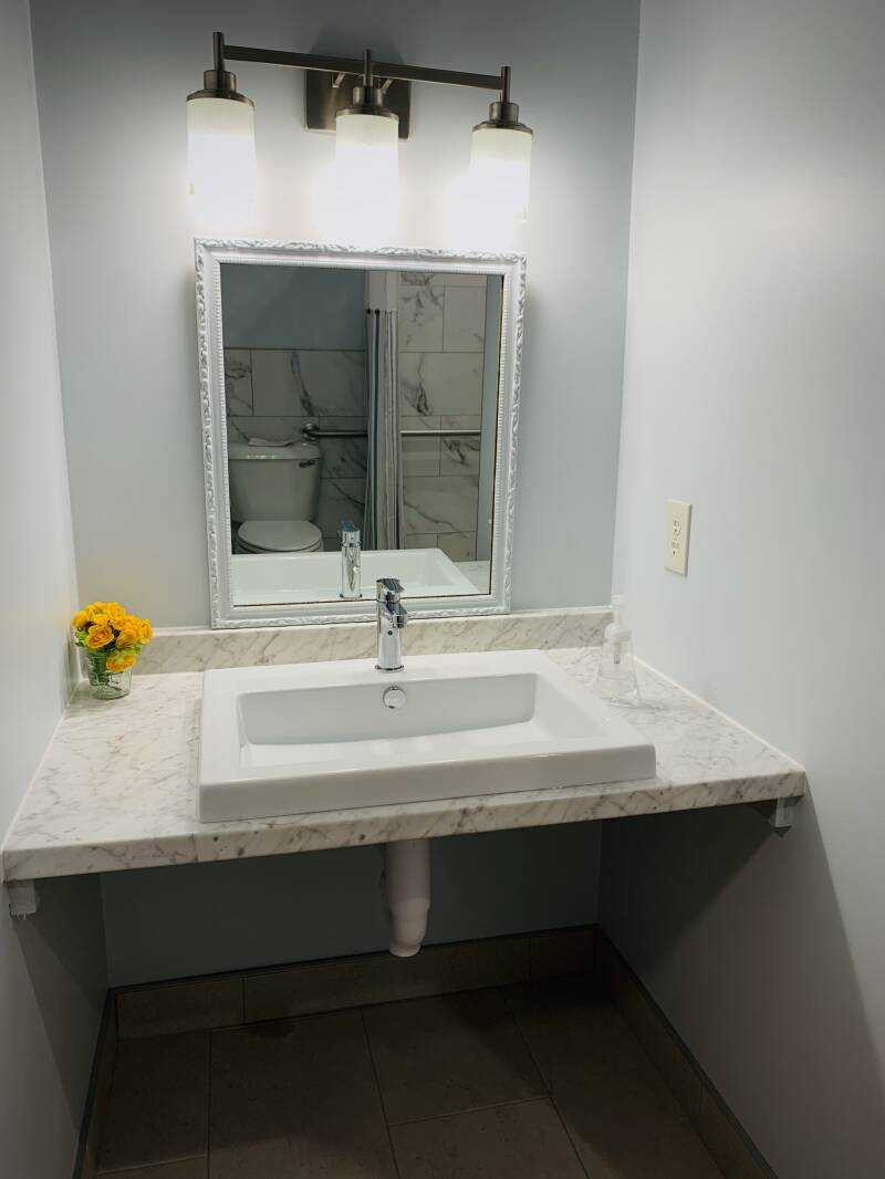 I didn't notice about the idea of "clearance under the sink/table" for wheelchair users. Knee clearance and toe clearance. I even didn't notice that hot water pipe causes leg burn injury if it doesn't have a protective cover. When I've learned about it, it blew my mind really. Thinking about the heights happened to me easily and naturally. But it was a bit different idea about a mirror in front of the sink. It's angled so that my husband can see better, has more visible area (face and upper body). I'm still learning more and more everyday. At least I can tell that I have my routine when I go out with my husband and it naturally happens to me now. I check these with a quick glance. •entrance doorway •table height •knee clearance and toe clearance •restroom space ✔️ It is good to learn and great to know about wheelchair users.