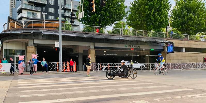Here is a photo of the 2nd and the 3rd handcycle athletes at this point.