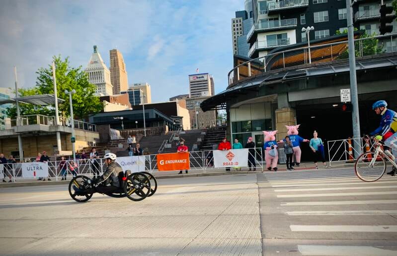 I skipped watching the start line. (But you know? It was so tempting to watch the most exciting moment with countdown, big crowds and huge cheers.) I hugged my husband tight as “Good luck hug” then I jogged to the first bridge entrance. Surprisingly there were only 4-5 people waiting athletes coming through. (I figured out later. My husband taught me that many spectators were at the other side of the bridge in Kentucky side.) When my eyes caught the PINK-leading-vehicle, I chanted “Ohhhh they are coming, they are coming”. And here comes my husband! He had an escort-cyclist with him. (So as all other handcyclers.) They showed up FIRST on the 1st bridge. Then 3 more handcyclers showed up shortly after. It was so exciting moments that they were about to “fight” the first uphill which they had to conquer.