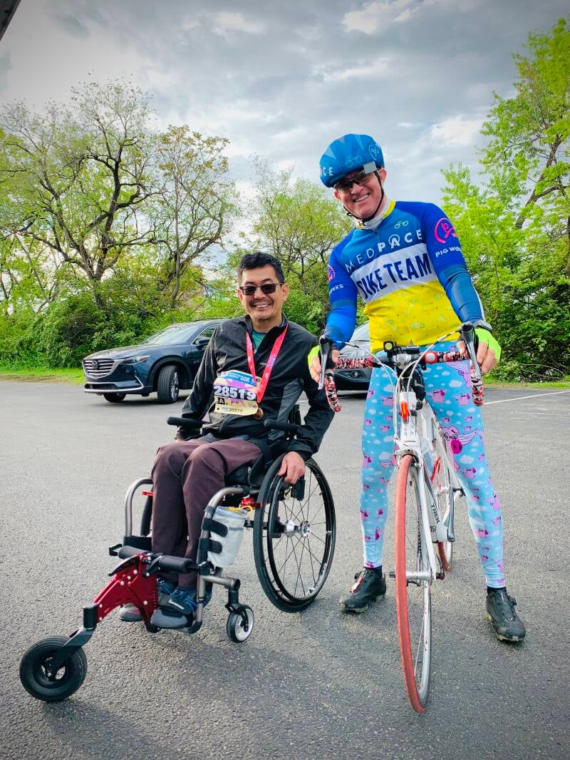 I realized that I didn't take photos much this time. I have a photo of us together, my husband and me in my phone. It's after the race at the parking lot, after he got off from handcycle and got on his wheelchair. Funny. I don't have a photo of us with his handcycle in my phone. Well, that fact proved how my entire day went.