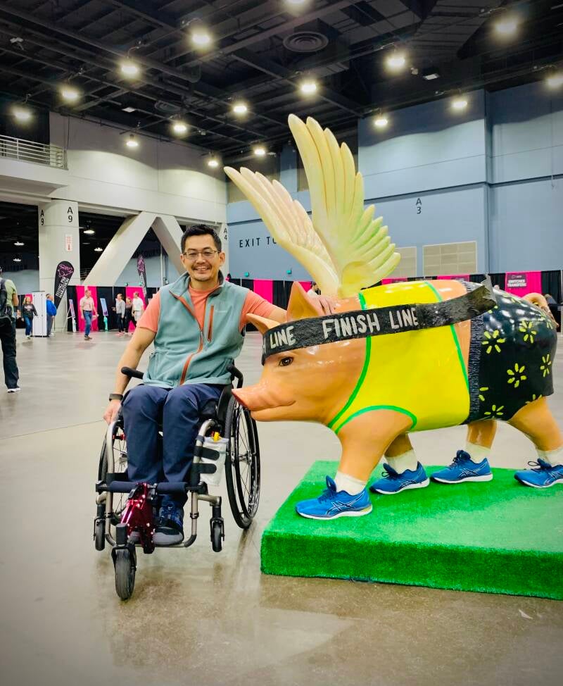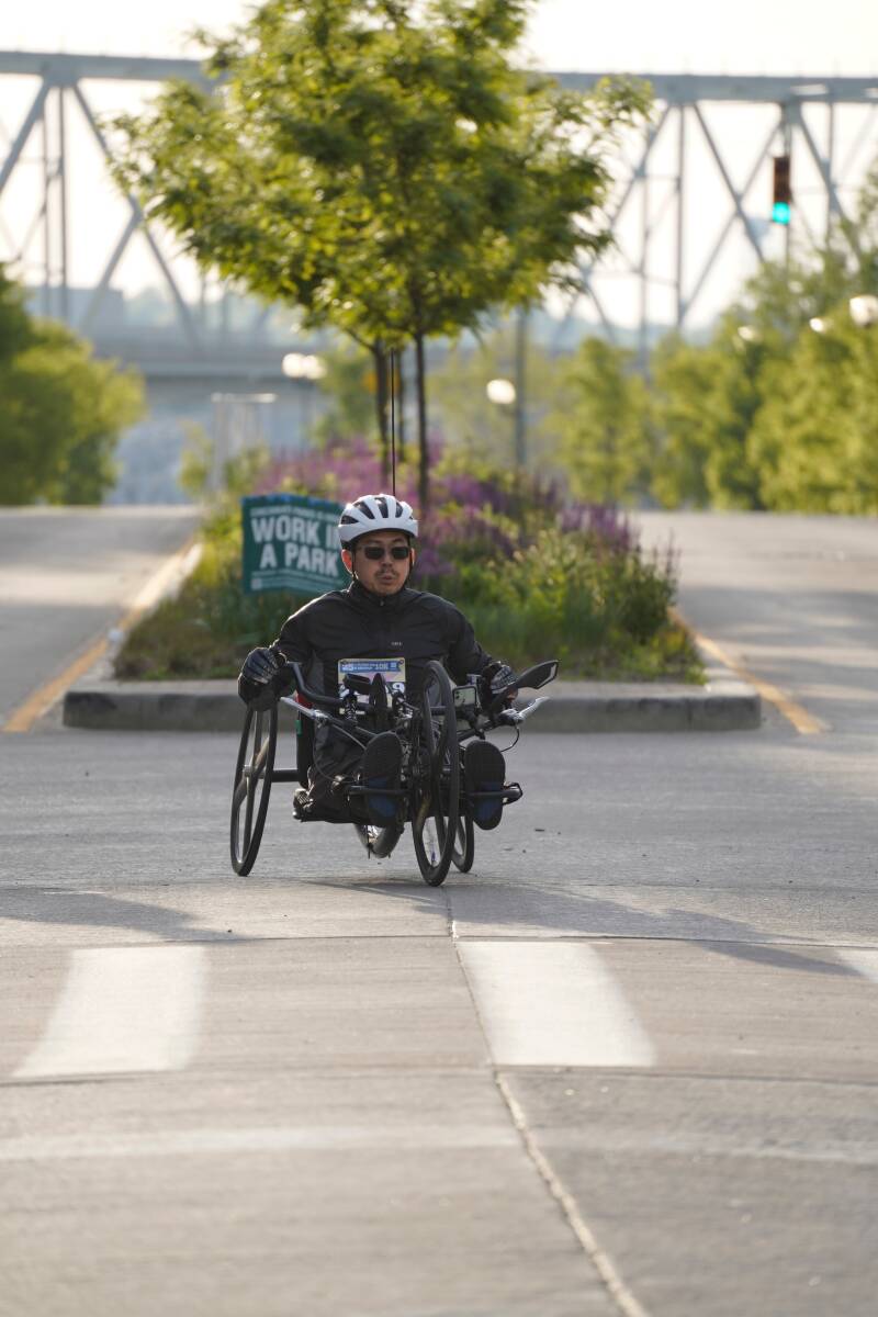 Eventually we were able to get our van and off to the parking lot at 6:15am. It was supposed to be “smooth and no-problem” to get to the parking lot. The road we had to go through was blocked/closed shockingly. I was panicked more. My husband managed to go through because we really needed to go to the lot next to the starting line. My nervousness and panicking mind-status were pretty high, I was too busy worrying about “letting my husband be ready for the race” that I couldn’t put on a smile at all. Thankfully my husband is always the one who could keep calm even at this “emergency situation”. He got on his handcycle, put his bib on, and moved to the starting line on time, he did put on a smile. I was just relieved at this moment thinking “ok, my job is done here. Now, my husband gotta enjoy it. That’s it.”