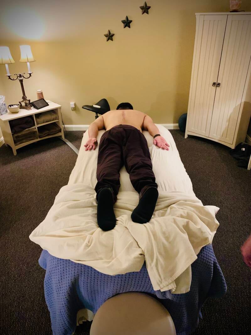Then I thought “oh no” seeing the width of the massage bed. The width was a just one person size. (If you lay down there, there is no extra space in your both sides.) So in my head, I had to think quickly how we make him turn on this width’s bed. Thankfully with “two” persons‘ assisting, he made it to be on his tummy on the bed. I didn’t think about “on tummy” position on narrow bed beforehand. I was glad it all worked out well. Yes, there is always something to learn. True.